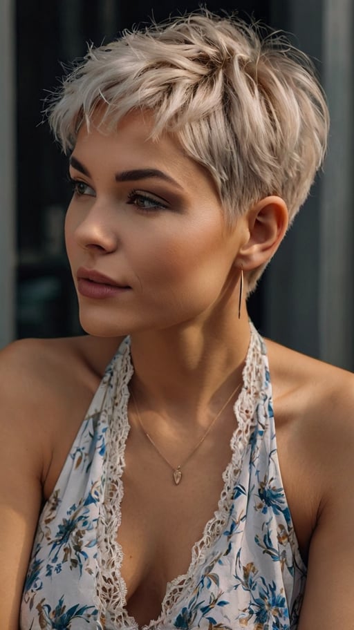 The Dye Short Hair blonde bob with bangs and highlights is a chic and modern hairstyle that is perfect for those who want to add some flair to their look. The blonde color adds a touch of brightness to your hair, while the bangs and highlights add volume and movement. This style is ideal for those with medium length red hair with bangs looking to go shorter. Pair this hairstyle with comfortable pants with ribbed waistband for lounging for a chic and relaxed look. This look is also suitable for colour ideas.