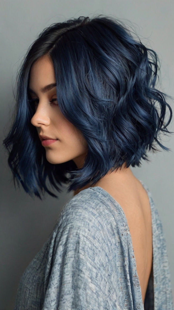 Opt for a carefree vibe by styling your Midnight Blue Hair with messy beach waves. This relaxed look enhances the depth of Plum Black Hair and adds a playful, textured appeal. Use a Round Brush and a curling wand to create loose, uneven waves, then finish with a light spritz of Volumizing Mousse for definition. Pair this effortless style with Casual Sports Bottoms With Tapered Leg for a casual outing or add a Gold Pearl Necklace With Polished Round Beads for a boho-chic touch. Perfect for everyday wear, this Hair Inspiration Color ensures your Hair Dye For Dark Hair stays vibrant and fresh.