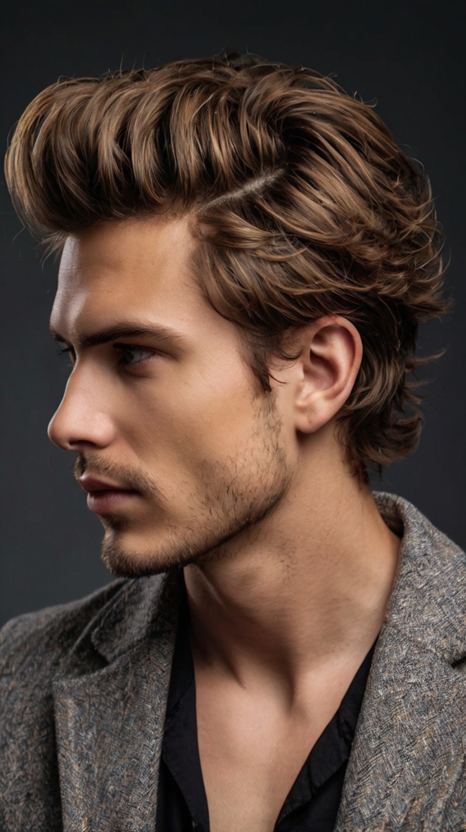 The pompadour fade long top short sides men hairstyle is a modern and stylish choice that combines the classic pompadour with a contemporary fade. This mens haircuts long look features a voluminous pompadour on top with a gradual fade on the sides, creating a sleek and fashionable appearance. It’s perfect for those who want a bold and sophisticated hairstyle. The pompadour fade allows you to choose the right products to maintain the volume and height. Pair this look with khaki straight pants for business casual for a polished and professional outfit.